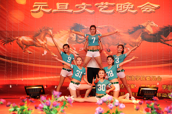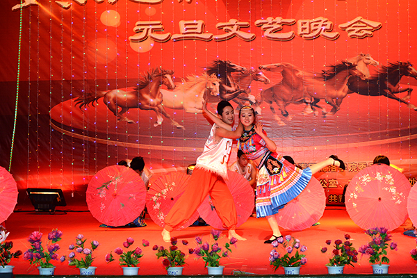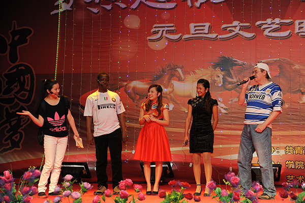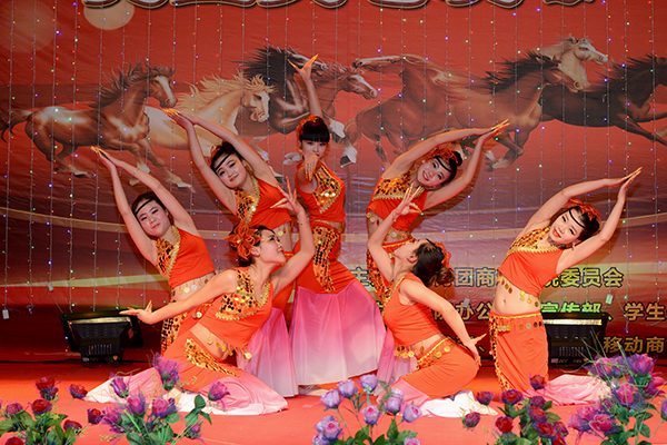 当晚的大学生活动中心喜气洋洋,洋溢着一派欢乐祥和的节日气氛。晚会在欢快喜庆的民乐合奏《迎宾曲》《开门红》中拉开了帷幕,18个节目涵盖歌曲、舞蹈、相声、器乐演奏、诗朗诵、情景剧、传统戏曲等多种表演形式,内容丰富、异彩纷呈。其中,苗族舞蹈《红苗伞》诙谐轻快,生动活泼,展示了苗家趣味横生的生活场景;独具地方特色的歌曲《圪梁梁》豪迈粗犷,刚劲奔放;歌舞剧《together》讲述了一个中国女孩在巴西旅游遇见四位外国友人后发生的的趣事,展示了我校外籍教师的风采;被同学们冠以“楼姨”昵称的宿舍管理员们也登台表演了《中国福字舞》,向全校师生展现了积极向上的生活态度;由我校女教职工合唱队带来的小合唱《草原迎宾曲》《回娘家》以其婉转动人的旋律、优美深情的歌声让人深深陶醉;蒙古舞《草原天堂》展现了草原人民对美好生活的追求与向往。晚会在歌伴舞《中国梦》的旋律中圆满落幕。