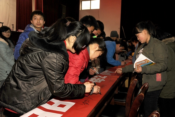 启动仪式结束后,师生们踊跃在学习雷锋宣传横幅上签字。
