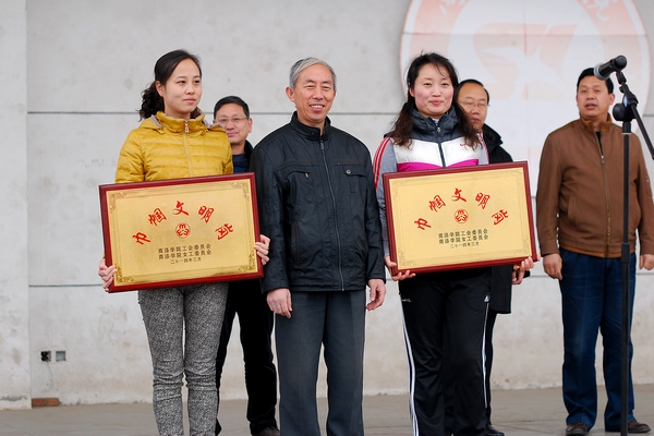 在第104个“三八”国际劳动妇女节即将到来之际,我校于3月5日下午,召开“三八”妇女节表彰会及女教职工趣味运动会,对一年来在教学管理各项工作中做出突出贡献的先进女教职工集体和个人进行表彰,以一场妙趣横生的趣味运动会喜迎妇女节。校党委副书记、工会主席左晓民出席表彰会,并向获奖集体和个人颁发了奖牌与证书。校工会委员、女工委员,工会各分会主席和女教职工参加了表彰会。