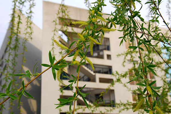 四月的校园,万物复苏,气温回暖,各种植物退下了冬日的臃肿,换上了充满生机的春装,校园里一派暖春的景象。柳树初生的嫩芽随风摇曳,些许杏花展露微白的花蕊,桃花偷偷羞红的笑脸,舞活了整个生机盎然的校园。同学们享受着鲜花和暖阳,在春光明媚的校园里读书、学习;趁着春意踏青、春游,用手机和相机留下美好的瞬间,在操场上锻炼的人也渐渐增多。
