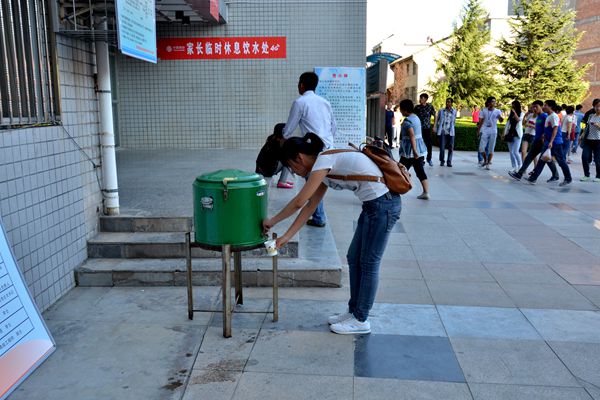今年我校在多个新生接待点设立了饮水处和休息处,为前来报到的学生和家长提供方便的休息场地,让新生从初来大学就体验到校园的温情。