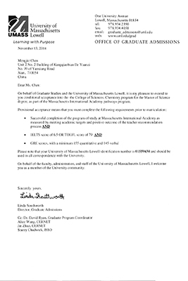 日前,我校化学工程与现代材料学院2010级化学专业学生陈梦婕收到了来自美国马萨诸塞大学洛厄尔分校的录取通知,被录取为该校化学专业研究生,将于2015年1月份正式赴美留学。