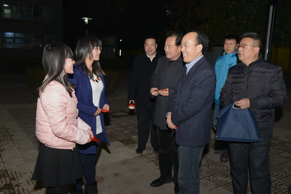 在学校办公室、保卫处、后勤保障处负责人的陪同下,彭虎军先后前往各处门卫、教学楼、公寓、图书馆、体育场值班室,后勤保障处公寓服务中心、水电班,保卫处警务室、监控室等一线岗位,与工作人员亲切握手,代表学校党政向大家拜年,对坚守在工作岗位上的工作人员表示感谢,并亲手送上节日慰问品。在慰问中,彭虎军详细询问了各部门的工作情况,要求每位工作人员在春节期间一定要把安全稳定放在首位,保证在校师生度过一个温暖、祥和的春节。