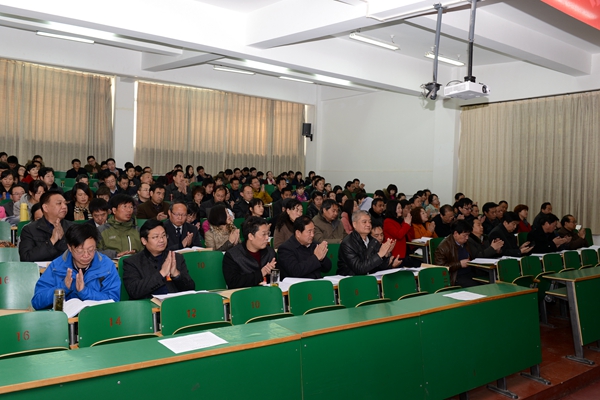 报告强调,2015年是我校全面深化教育教学改革的关键之年,是全面完成“十二五”规划的收官之年,全体教职员工必须要有前所未有的气魄、勇气、胆识和担当,不断强化“学习、法制、担当、执行、导向”五种意识;落实“坚持正确的政治方向、坚持学校发展为第一要务、坚持用团结品质凝聚学校发展的正能量、坚持廉政勤政,风清气正、坚持个人价值与学校目标价值趋同”五个坚持;把握好“发展与民生、内部管理挖潜与外部支持争取、人才引进与岗位成才、思想政治教育与政策制度引导、‘要我干’与‘我要干’”五个关系,突出“政治强、工作实、标准高、服务真、作风硬”的五字工作准则。万众一心,同心同德,以勇于担当的气魄和饱满的工作热情,以抓铁有痕、踏石留印的良好作风全身心投入到学校事业中去,切实提高工作执行力,保证工作落实,全面完成2015年工作任务,为把我校早日建成特色鲜明、多学科协调发展的应用型本科院校而努力奋斗!