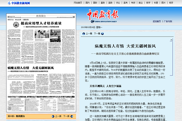 3月30日,《中国教育报》第8版以《病魔无情人有情 大爱无疆树新风》为题,对我校践行社会主义核心价值观救助患白血病教师王珍琪系列活动进行了报道。该文一经刊发,新华网、中国网等全国各大媒体纷纷转载,在社会上引起了强烈反响。