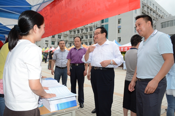 副校长魏书堂在教务处处长李超、学生处处长石启英、校团委副书记彭晓邦的陪同下,来到活动现场检查指导工作,亲切看望了参加咨询会的各高校工作人员,并嘱咐我校工作人员和学生志愿者尽心尽力为展台工作人员和考生及家长提供满意的服务。