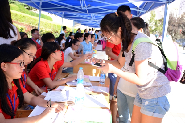 为保证新生顺利入学,学校安全面按排部署,各部门紧张有序投入工作。为方便外省市新生顺利入校,学校在火车站、汽车站和校门口等地方分别设立迎新接待点,校车一路畅通,日夜不间歇接送,为新生及家长们提供便利服务。校内设立了新生咨询处、行李寄存处、公安执勤处、医疗服务处、家长休息区,还专门为家境贫困的学生开放“绿色通道”,办理助学贷款。路口醒目位置都设置有迎新指示牌,志愿者们穿梭其中,忙碌地为新生提供各类咨询和帮助。