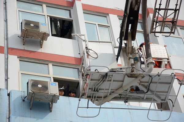 消防官兵竖起云梯,两名学生安全获救