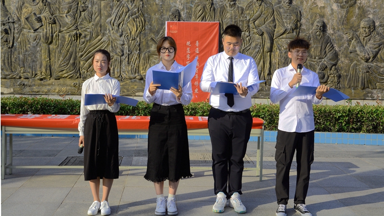 人文学院学生代表王滢在表态发言中呼吁全体学生要规范使用普通话,让规范语言之花开遍美丽的校园。学生朱怡宁、丁欣玉为大家表演了相声《普通话》,通过生动有趣的表演向展示了不良语言习惯及普通话的别样韵味,切实增强了大家的语言规范意识。王林等学生向大家朗诵了红色诗歌《永远跟党走》,带领大家重温了先辈们浴血奋战的革命岁月,让大家在诗歌中感悟党的峥嵘岁月,体会语言的动人魅力。