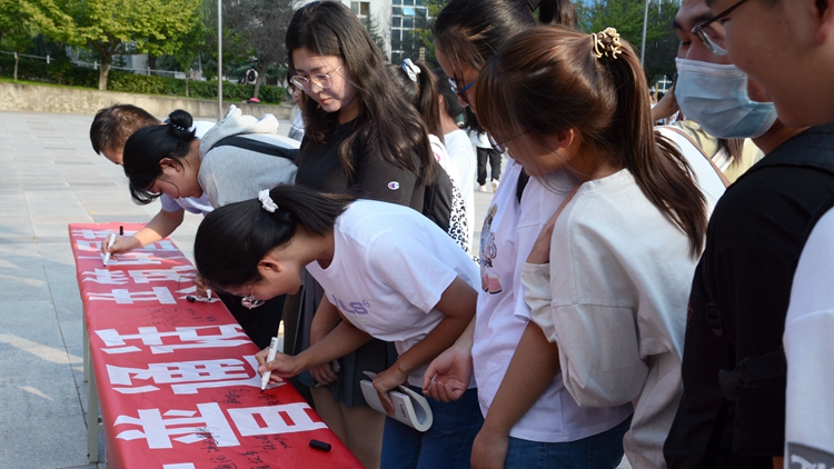 现场师生在推广横幅上进行签字,表达了学习国家通用语言文字的决心。