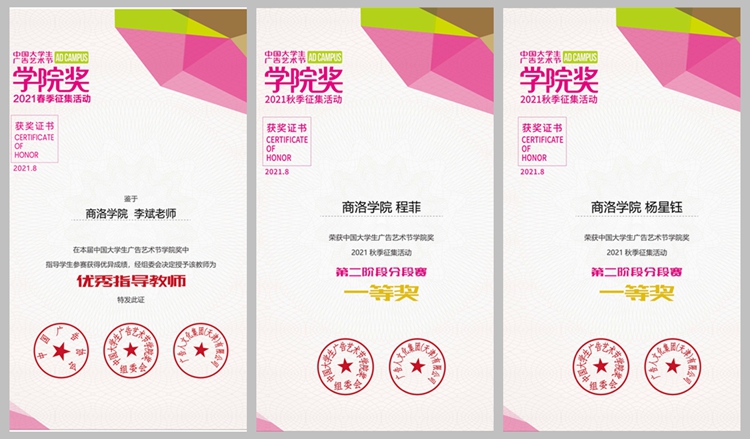近日,2021年中国大学生广告艺术节学院奖大赛秋季第二分段赛圆满结束,我校获得一等奖2项,二等奖3项,三等奖2项,优秀奖1项,入围奖16项,1名教师获得“优秀指导教师”,这是我校参加此类比赛首次获奖。