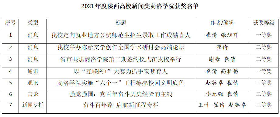在2021年度陕西高校新闻奖评选工作中,我校共送报各类新闻作品8件,有3件消息类作品、2件通讯类作品、1件言论类和1件新闻专栏类作品获奖。其中《我校定向就业地方公费师范生招生录取工作成绩喜人》获得消息类一等奖,《以“互联网+”大赛为抓手筑梦育人》获得通讯类一等奖。《我校举办陈彦文学创作全国学术研讨会高端论坛》《省市共建商洛学院第三期签约仪式在我校举行》获得消息类二等奖,《商洛学院实施“六个一”工程擦亮学校文明底色》获得通讯类二等奖,《强国强党:党百年奋斗历史经验的主线》获得言论类二等奖,《奋斗百年路启航新征程专栏》获得新闻专栏类二等奖。