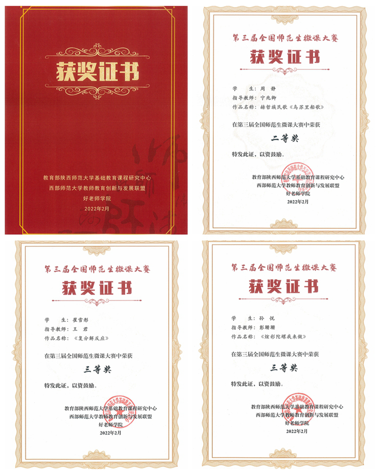 近日,第三届全国师范生微课大赛结果公布。由我校教师宁兆卿指导、音乐学专业学生周静完成的作品《赫哲族民歌<乌苏里船歌>》荣获二等奖,教师王君指导、化材学院学生崔雪彤完成的《复分解反应》以及教师彭珊珊指导、学前教育学专业学生孙悦完成的《炫彩陀螺我来做》获三等奖。