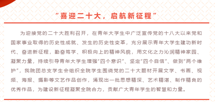 城乡规划与建筑工程学院举办了“喜迎党的二十大,启航新征程”活动,通过展现学生自行创作的党的二十大题材文学、书画、视频、海报、摄影等文艺作品,充分展示了青年大学生奋进新征程、建功新时代,勤奋笃学、积极向上的精神风貌。