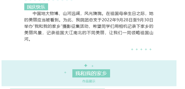 经济管理学院举办了“我和我的家乡”作品展,通过同学们记录的家乡美丽风景,展现祖国的大好河山,激发学生爱国之情和建设家乡之志。