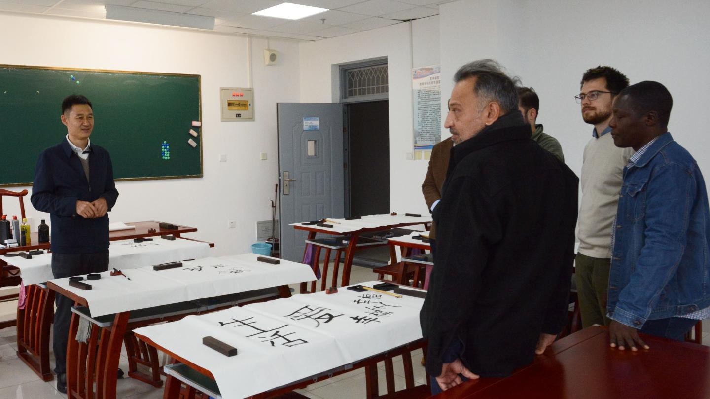 在工作人员的引导下,外籍教师先后参观了经管学院教室、综合实验室、特色计算机实验室,电信学院实验室、人工智能机器人实训室,艺术学院智慧书法实验室、艺术展厅,商洛文化暨贾平凹研究中心,商洛红色文化资料馆,陕西省尾矿重点实验室,学校发展成就展厅及秦岭植物标本陈列室。在智慧书法教室,艺术学院教师樊洪涛为外籍教师介绍了中国书画的传承与发展历史,并指导外籍教师进行了书法体验,“沉浸式”感受了中国传统文化魅力。