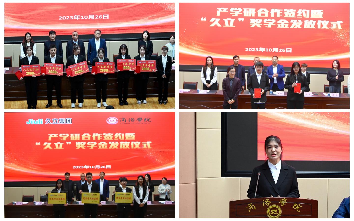 仪式上,化材学院院长周春生和周宇宾分别代表校企双方签订了《商洛学院久立集团共建产学研基地协议》。周宇宾为首届获得“久立”奖学金的10名学生颁发荣誉证书和奖学金。久立集团人力资源部经理马蓉丽为首批“久立”优良学风班集体颁发奖牌和奖金,久立集团人力资源部副经理吴旭群为首届获得“久立”奖学提名奖的2名学生颁发荣誉证书。
