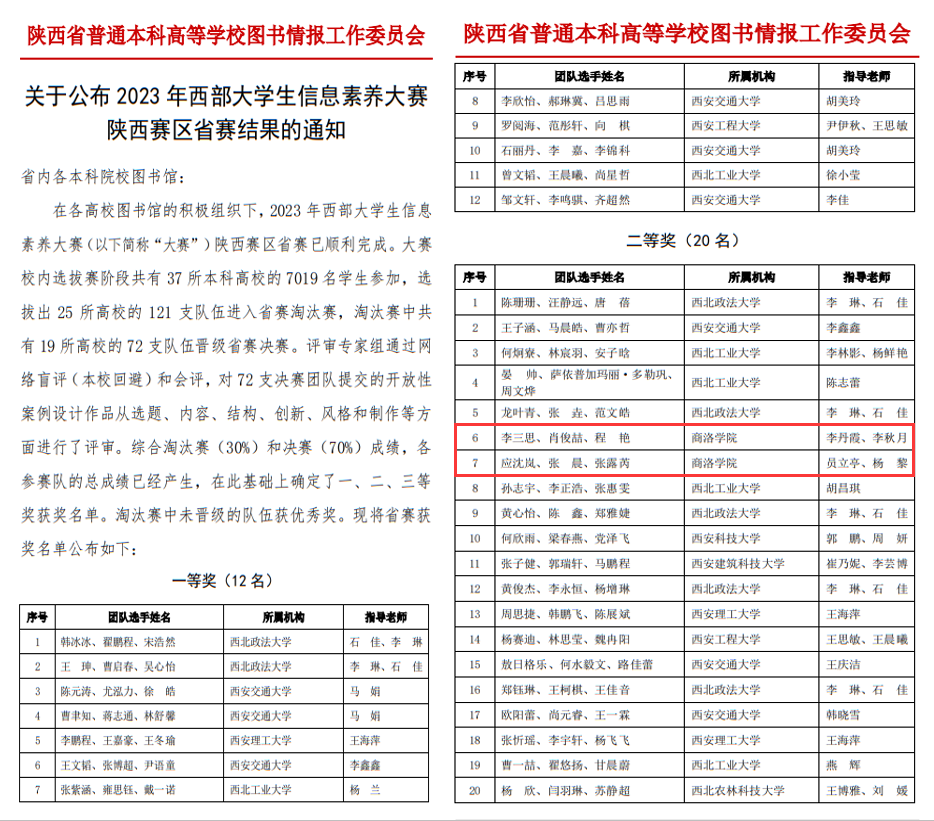 11月22日,2023年西部大学生信息素养大赛陕西赛区省赛结果公布。我校两队土木2301李三思、网络2301肖俊喆、会计学2324程艳、电气2103应沈岚、电气2203张晨、应化2111张露芮6名学生获二等奖,一队护理2331周靖哲、营养2301韩卓睿、营养2101司凯利3名学生获三等奖,一队信管2301刘硕、信管2302王雅、制药2202段月瑞3名学生获优秀奖。这是我校首次参加信息素养类大赛并获奖,获奖位次排名居全省高校前列。
