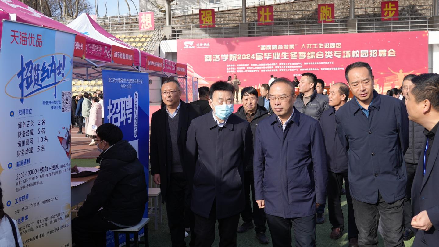 校党委副书记彭虎军,省人才中心毕业生工作部部长朱英杰,西安市人社局党组成员、副局长郑化卫,商洛市人社局党组成员、副局长关威,西安市就业中心副主任任雁庆,西安市职介中心副主任张战仓,西安市人才中心毕业生工作部部长郭梁涛,商洛市人才中心副主任董毅等领导现场指导招聘工作。学生处负责人,各二级学院党委、党总支书记及全体毕业班辅导员参加招聘会并为毕业生提供就业指导服务。