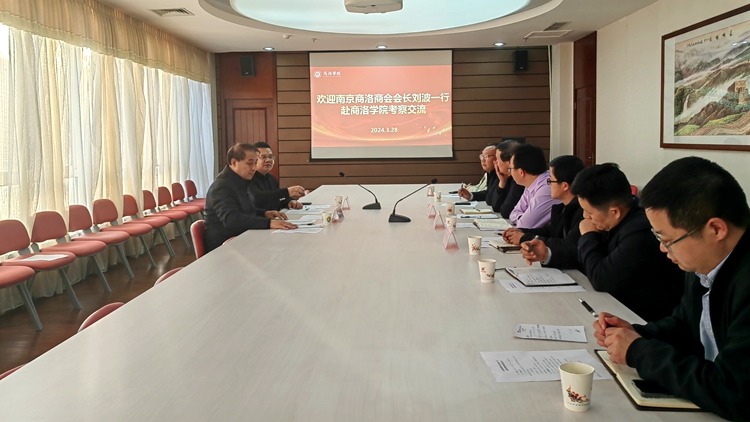 王新军代表我校对刘波一行的到来表示欢迎,并对南京市商洛商会对我校的关心和支持表示感谢。他指出,南京市商洛商会是加强商洛籍南京商界人士同家乡联系沟通的纽带和桥梁,为政府与企业、企业与企业之间联络搭建了平台,极大地促进了宁商协作交流。他希望,商会能够充分利用其资源优势,为我校牵线搭桥,拓展我校与南京企事业单位的合作领域,在产教融合、实习就业、科研平台建设等方面争取更多合作机会,为我校应用型人才培养提供更多支持,依靠宁商协作机制共同推动商洛区域科技创新。