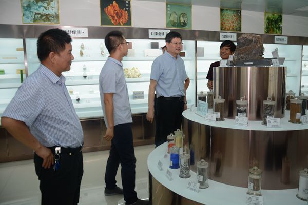 史高领一行深入重点实验室沙盘标本陈列室、有价元素提取室、材料制备室、材料性能检测室、尾矿无害化处理室等处,详细考察了实验室硬件设施建设、配备情况和项目研究工作开展进度。我校化材学院院长、尾矿资源综合利用重点实验室主任周春生做了详细讲解。