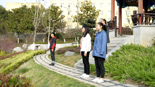 7:10,参加升旗仪式的全体师生列队整齐、精神饱满,伫立在升旗台前。化材学院国旗护卫队迈着整齐的步伐走向升旗台,将国旗护送到升旗台前。在雄壮的国歌声中,鲜艳的五星红旗冉冉升起,迎风飘扬。现场气氛庄严肃穆,在场的每个人都神情严肃,心潮澎湃。在运动景观平台晨读和学苑路行走的同学听到国歌声,也立即面朝国旗方向肃立行注目礼,向国旗表达最崇高的敬意。