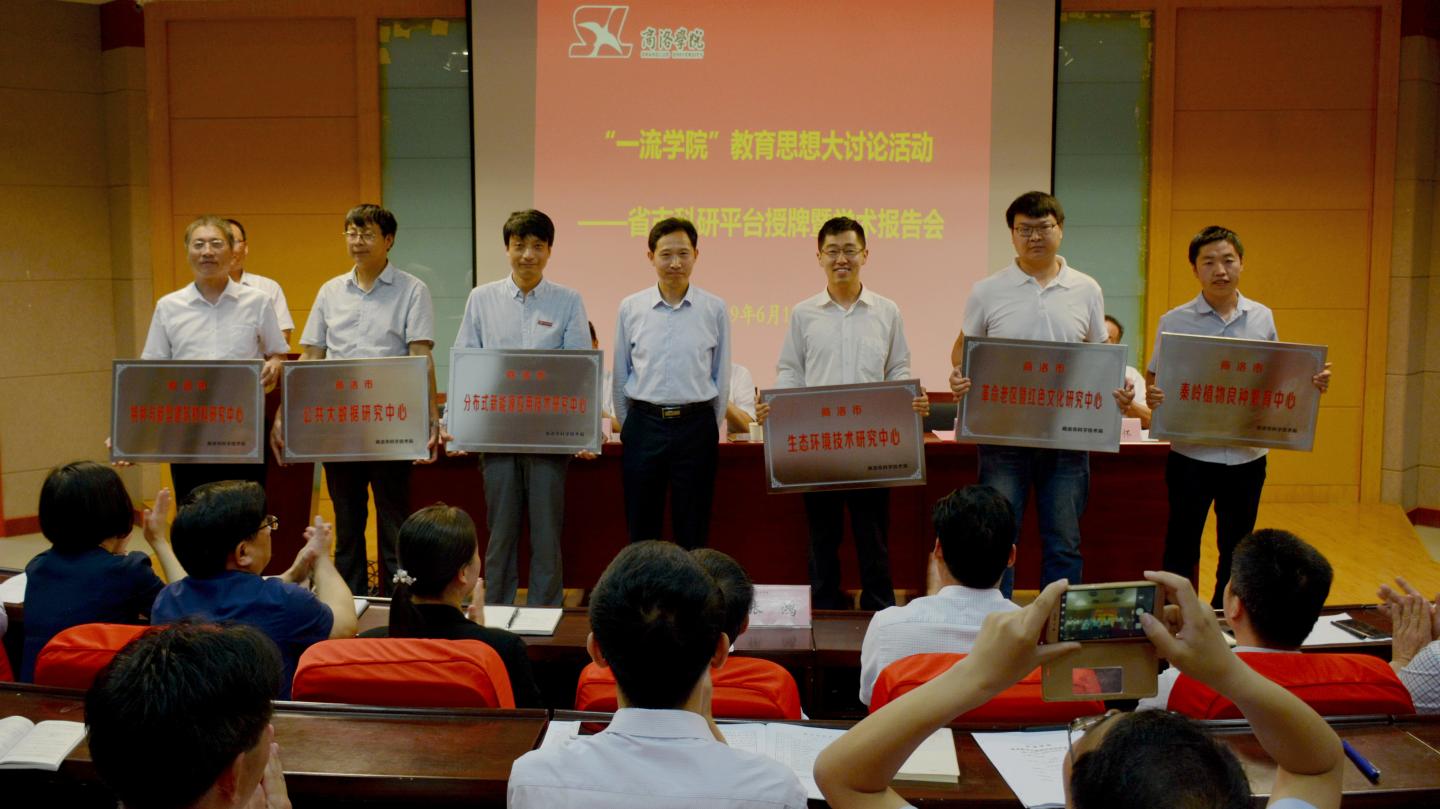 陕西省教育厅科技处处长甘世平为商洛文化暨贾平凹研究中心授牌;校党委书记龙治刚为陕西秦岭特色生物资源产业技术研究院授牌;校长范新会为秦岭南麓生态环境保护研究创新团队授牌;商洛市科技局局长赵绪春为商洛市生态环境技术研究中心等6个市级工程技术研究中心授牌。