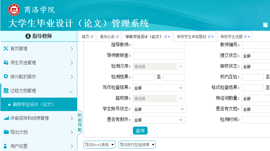——线上查重、方便快捷。教务处与中国知网多次沟通协商,为我校量身定制了“商洛学院毕业论文(设计)管理系统”,将全体2020届毕业生及论文(设计)指导教师基本信息导入系统,免费向师生开放,便于师生论文查重、在线远程指导与实时管理,助推我校信息化管理水平不断提升。为了确保了师生论文查重及在线指导工作顺利开展,教务处还提前进行了多次系统调试、测试,并编制《毕设管理系统学生查重操作手册》《毕设管理系统教师审核操作手册》,对师生论文查重过程中的疑难问题给予悉心指导和帮助。一名学生在使用“商洛学院毕业论文(设计)管理系统”后感慨道:“毕设管理系统功能强大,方便实用,既省时省力省事,又节省经济开支,还实现了全覆盖,对于高效高质完成毕业生毕业论文(设计)发挥了重要作用”。
