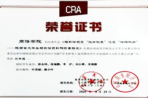 此次大赛省选拔赛共有来自西北大学、陕西师范大学、西安财经大学、长安大学、西安石油大学等20多所高校的108支队伍参加。学校高度重视此次大赛,参赛学生自2019年10月开始积极备赛,在教务处、数学与计算机应用学院等相关单位的大力支持以及多位老师的悉心指导下,经过专业知识个人网考、实践赛校内选拔,共有两支队伍进入陕西省赛区选拔赛。经过激烈比拼,参赛队伍凭借详实规范的统计调查方案和数据分析报告以及大方得体的线上表现,由我校应用统计学专业17级学生彭永玲、张瑞腾、李沪、刘小翠、李博雅代表队的作品《超前消费是“救命稻草”还是“精神鸦片”——陕西省大学生超前消费影响因素探究》荣获国家三等奖。