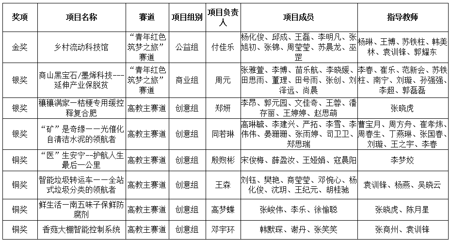 本届大赛自今年6月启动以来,我省共有106所学校报名参加,参赛项目突破4万项,较去年增加近3000项,参赛学生突破18.4万人次,较去年增加1.8万,经校级初赛、网络初审、会议评审、线上路演、评委会评审等环节后,最终产生金奖100项,单项奖7项。我校化材学院学生付佳乐负责的《乡村流动科技馆》项目获“青年红色筑梦之旅”赛道金奖;化材学院学生周元负责的《商山黑宝石/墨烯科技---延伸产业保脱贫》项目获得“青年红色筑梦之旅”赛道银奖;生物学院学生郑妍负责的《穰穰满家—桔梗专用缓控释复合肥》项目、化材学院学生同若琳负责的《“矿”是奇缘——光催化自清洁水泥的领航者》项目获得高教主赛道银奖;健康管理学院学生殷煦彬负责的《“医”生安宁--护航人生最后一公里》项目、生物学院学生高梦蝶负责的《鲜生活—南五味子保鲜防腐剂》项目、电信学院学生王森负责的《智能垃圾转运车——全站式垃圾分类的领航者》项目、电信学院学生邓宇环负责的《香菇大棚智能控制系统》项目获得高教主赛道铜奖。