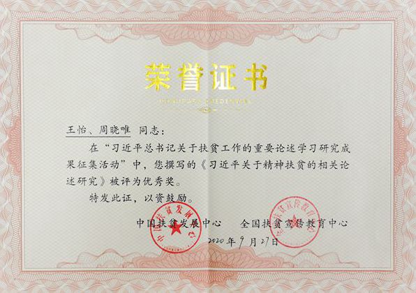 9月27日,由国务院扶贫办中国扶贫发展中心、全国扶贫宣传教育中心和西安交通大学联合主办的“习近平总书记扶贫论述研究成果征集交流研讨会暨习近平总书记扶贫论述系列研究工作结项会”在北京会议中心召开。会议公布了习近平总书记扶贫论述研究成果征集获奖名单并颁奖,商洛市脱贫“阻返”长效机制研究团队负责人、我校教授王怡主持完成的《习近平关于精神扶贫的相关论述研究》荣获优秀奖。