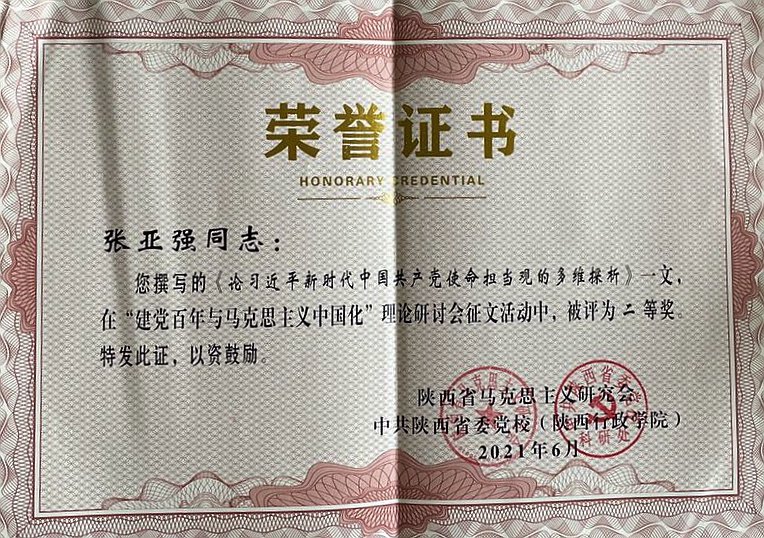 为隆重庆祝建党百年,总结回顾马克思主义中国化的历史进程、宝贵经验、思想启示,陕西省马克思主义研究会与中共陕西省委党校共同举办了“建党百年与马克思主义中国化”理论研讨会征文活动。我校马克思主义学院副教授张亚强撰写的论文《论习近平新时代中国共产党使命担当观的多维探析》在评选活动中荣获二等奖。