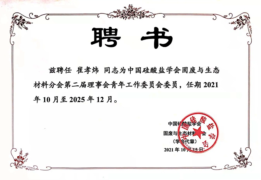 10月15日-17日,第四届中国固废处理与生态材料学术与技术交流会在武汉召开,会议推举审定了第二届中国硅酸盐学会固废与生态材料分会理事会建筑固废学术委员会名单(110名),我校化材学院副院长崔孝炜博士受邀线上参会,并在会上被聘为中国硅酸盐学会固废与生态材料分会第二届理事会青年工作委员会委员。
