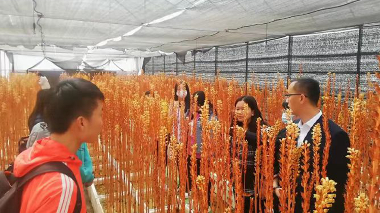 师生在展览大厅通过动画模式直观地了解了天麻全生育期管理与开发。在天麻育种实验基地,项目团队负责人赵永平带领学生现场回顾了《药用植物资源学》课程讲解的天麻基本特性和关键生长期,实地指导学生进行了天麻人工授粉操作。产业园技术人员现场指导学生进行了天麻袋料栽培,详细讲解了每一个步骤的理论原理,强调了关键操作技术要点,在场学生认真学习并亲自动手实践栽培天麻。