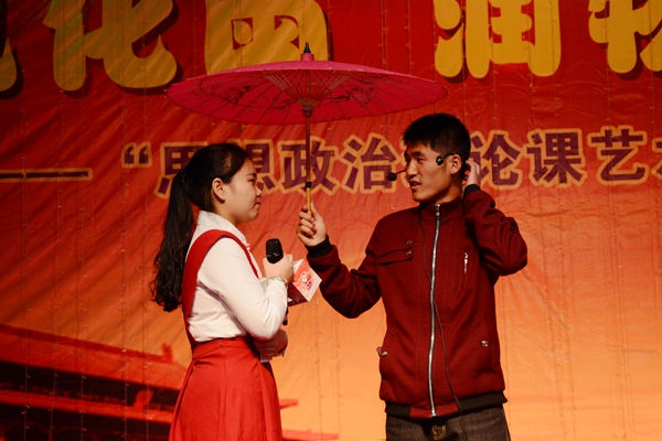 本次汇报演出活动由马克思主义基本原理教研室主任教师武晓婕总体策划,所有演员均来自于其任课的2015级6个班级。活动采取由代课教师在开学初确定主题,学生自己收集资料,学生自编自导自演,代课教师加以辅导的方式进行,准备工作前后耗时一个多月。演出将思想政治理论课的教学内容与艺术方法有机结合,演出节目包括情景剧、三句半、歌曲联唱、故事讲述、诗歌朗诵等多种形式,演出中间穿插宪法知识问答环节。情景剧选取与大学生密切相关的生活片断,真挚感人,引人深思;三句半用曲艺的形式,讴歌法治中国的建设,引导人们关注交通安全;歌曲联唱显现了当代大学生与时代同呼吸共命运,心怀感恩勇于担当的情怀;故事讲述再现了最美中国人的风采,讲者动容听者动情;诗歌朗诵带领大学生品味爱情,感悟人生。演出中演员表演形象逼真,动作到位,神态自然大方;现场观众如同身临其境,忽而感动落泪,忽而会意微笑。演出丰富了校园文化生活,起到了用艺术熏陶进行思想启迪,潜移默化教育的良好效果。