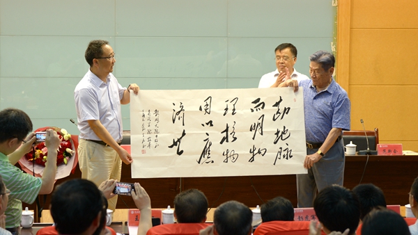为表达对赵鹏大院士的敬意和感谢,龙治刚代表学校向赵院士赠送了“勘地脉而明物理,格物用以应济世”书法作品。化材学院青年教师向赵院士赠送了鲜花。