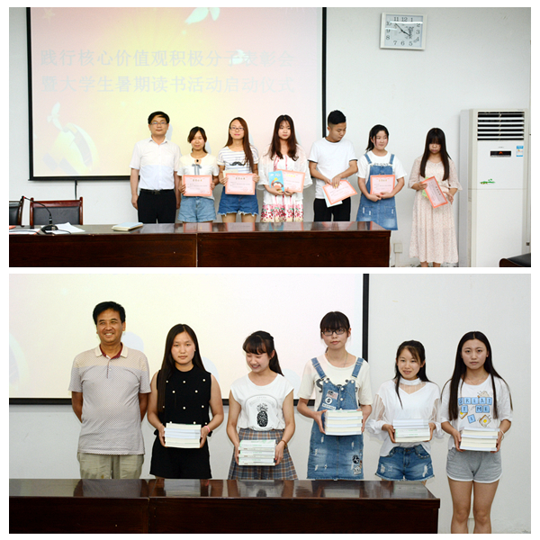 为贯彻落实习近平总书记关于全国哲学社会科学工作重要讲话精神,宣传弘扬社会主义核心价值观,推动大学生阅读经典著作,学习社会科学,坚定理想信念,6月29日,我校思政部举办“践行核心价值观积极分子表彰会暨大学生暑期读书活动”启动仪式。副校长刘勇出席表彰会。会议由思政部副主任李龙强主持。思政部教师为受表彰学生发放了证书和暑期阅读书籍。