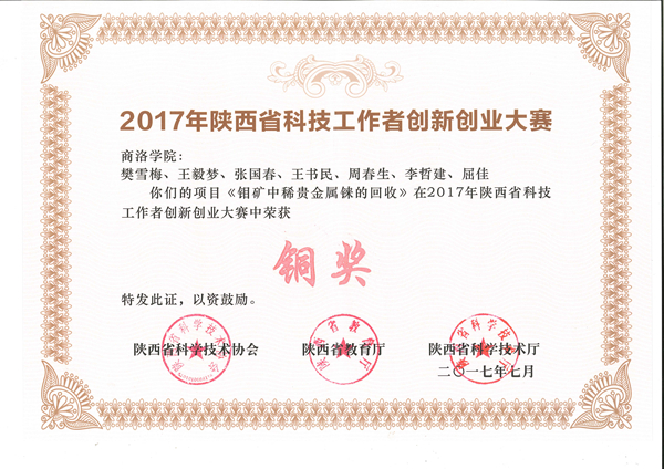近日,由陕西省科协、陕西省教育厅、陕西省科技厅主办的2017年陕西省科技工作者创新创业大赛在西安举行,我校化材学院教师樊雪梅等7人共同申报的项目《钼矿中稀贵金属铼的回收》获得大赛铜奖。这也是我校教师首次参加全省创新创业大赛并获奖。