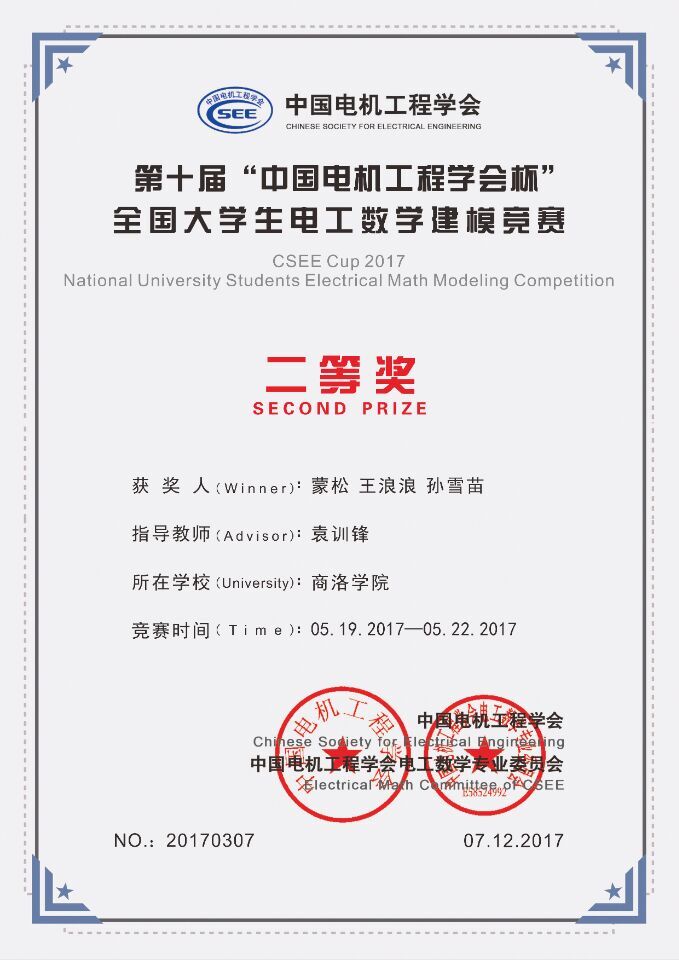近日,由中国电机工程学会批准、电工数学专委与全国大学生电工数学建模竞赛组委会主办的第十届“中国电机工程学会杯”全国大学生电工数学建模竞赛结果揭晓。我校蒙松、王浪浪、孙雪苗等3个团队荣获国家级学会二等奖,卞静伟、赵菡、张睿赟等7个团队荣获国家级学会三等奖,这是我校组队参加此项赛事以来获得的最佳成绩。