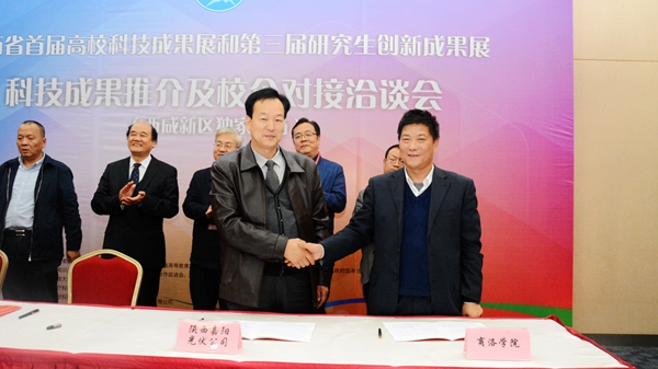 在校企对接洽谈会上,校长范新会与陕西嘉阳光伏电力服务有限公司董事长许卫峰代表双方签订了校企合作协议。协议规定,双方以横向课题的形式共同完成我校专利“一种智能型光伏发电太阳伞”的开发,嘉阳光伏电力公司拟投资20万人民币作为课题的使用经费,对该专利进行进一步的研发、优化、生产。