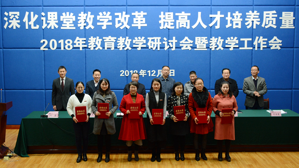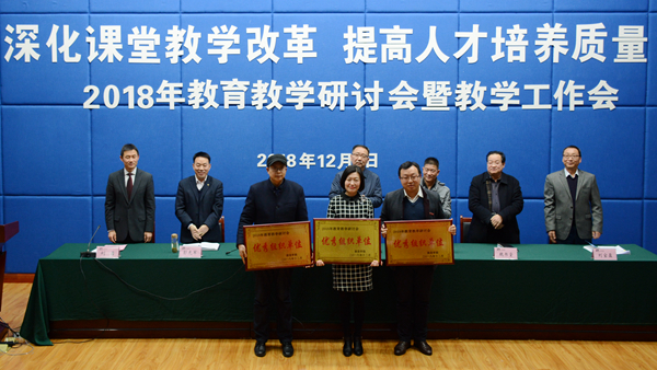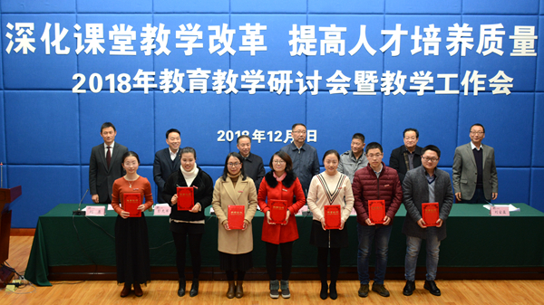 大会对我校2018年度优秀教案及优秀电子课件、实习优秀指导教师、2018届校级优秀毕业论文指导教师、第四届“互联网+”大学生创新创业大赛校赛获奖教师、2018年度青年教师教学技能竞赛获奖教师、首届课堂教学创新大赛获奖教师、2018年教育教学研讨会优秀论文及优秀组织单位进行了表彰,刘宝盈宣读了表彰决定。