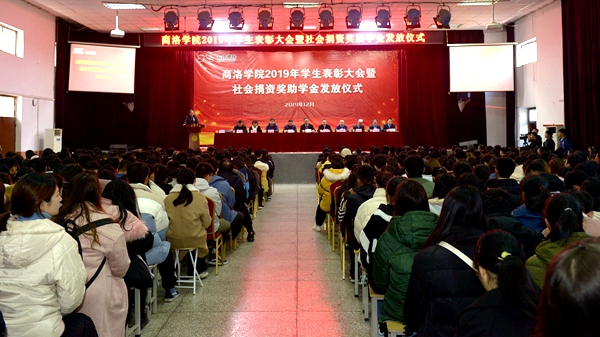 12月11日,我校2019年学生表彰大会暨社会捐资奖助学金发放仪式在大学生活动中心隆重举行。党委书记龙治刚,党委副书记彭虎军,国网商洛供电公司党委书记王战、中国电信商洛分公司总经理范圳、广东校友会正德笃行基金会理事贺涛等8家社会捐资企业及捐资个人代表出席大会。大会由学生处处长石启英主持。