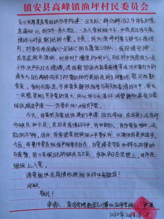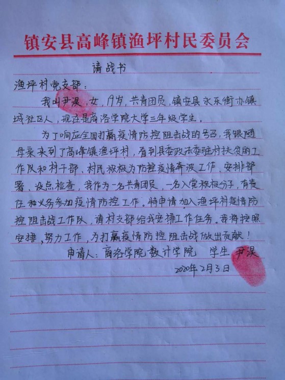 “请村支书给我安排工作任务”“请党组织在疫情防控阻击战中考验我”。这掷地有声的话语,是商洛学院大三女学生尹淏2月3日和2月6日给高峰镇渔坪村第一书记王新桥递交的《请战书》和《入党申请书》里的两句话。