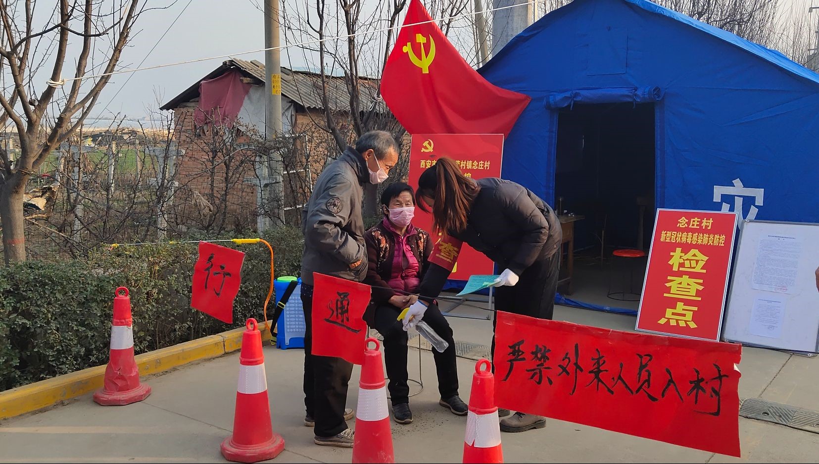 周元为村民用酒精消毒、宣传疫情防控知识