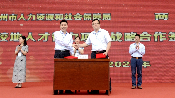 彭虎军与郭连伟代表双方签署校地人才智力项目战略合作协议,代表我校接受“人才工作站”授牌。