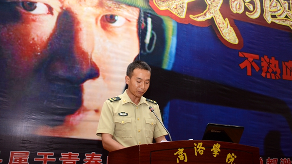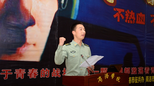 为了培养大学生的国防意识,增强大学生的国防观念,培育大学生的爱国情怀,积极推进我校征兵工作,6月12日下午,我校与商洛市征兵办公室、商洛市国防办联合举办征兵宣传进高校暨国防教育活动。校党委副书记彭虎军、商洛军分区参谋长李水龙、中国人民解放军边防学院南卫华副教授、商州区人武部政委张翔和商洛籍现役军人杨西岭、周森出席活动。活动由我校人民武装部部长石启英主持。