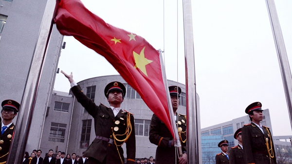 庄严嘹亮的国歌拉开了仪式的序幕。鲜艳的五星红旗冉冉升起,旗手们踏着矫健的步伐,以饱满的热情,庄严的护送五星红旗走向升旗台。全体人员肃立向国旗行注目礼。