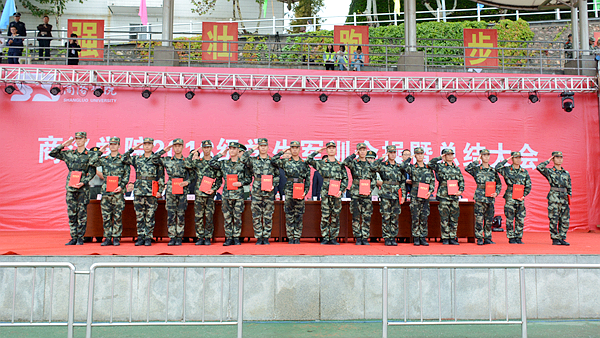 汇报表演结束后,与会领导分别为军训队列先进集体、军训内务整理先进集体、军训工作优秀教官、军训工作先进个人、参训优胜标兵颁发了奖牌和荣誉证书。