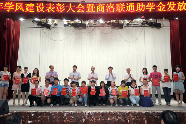 为了进一步推进学风建设和学生自主创业工作,营造良好的育人氛围,5月22日下午,我校隆重召开学风建设表彰大会,对2012年度国家奖学金、国家励志奖学金获奖学生进行表彰,对田亦柏等5名自主创业大学生进行奖励,对2012年学风建设先进集体进行表彰,同时为程时妍等20名2013年商洛联通助学金受助学生发放了助学金