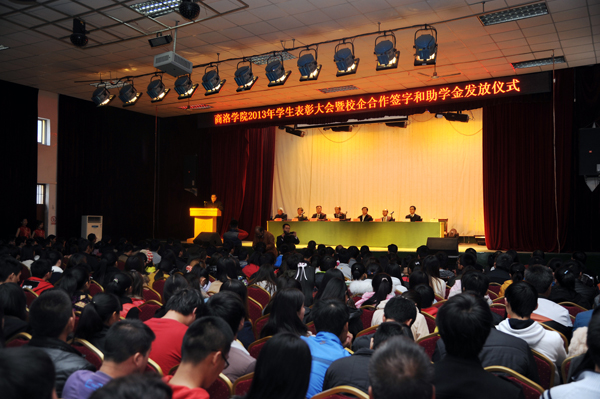 11月20日,我校隆重举行2013年学生表彰大会暨校企合作签字和助学金发放仪式。校党委书记张景书、院长刘建林、党委副书记左晓民、副院长魏书堂,商洛供电局党委书记陈飞、纪委书记杨军,商洛市邮政局局长王伟、调研员王林出席大会。各系各相关部门负责人、获奖学生及学生代表参加大会。会议由左晓民主持